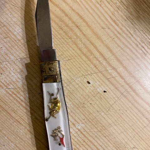 Tysk mid-century lommekniv. Fortsatt snappy og inntakte skjefteplater, noe som er ganske sjeldent for denne typen kniver da de som oftest er herpa på en eller annen måte. Noe korrosjon som man må forvente.