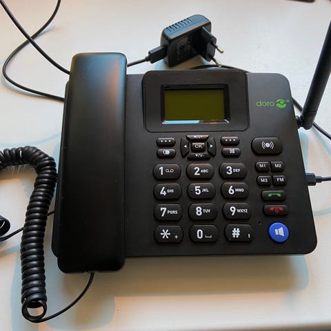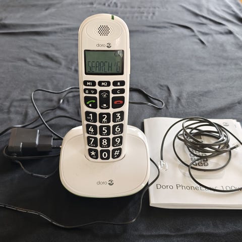 Doro PhoneEasy 100w trådløs telefon i hvit farge. Modellen har store, tydelige taster og display. Bildet viser to håndsett med tilhørende ladestasjoner og strømadaptere, samt bruksanvisning. Egnet som fasttelefonløsning i hjem eller på kontor, spesielt for brukere som foretrekker enkle og oversiktlige knapper og funksjoner.