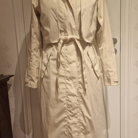 Ny ubrukt frakk i beige farge med mønster på krage ,ermer og belte.B skulder bak ca 42 L fra kragen ca 104cm Står at det er str S men er mere en M