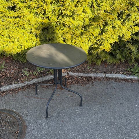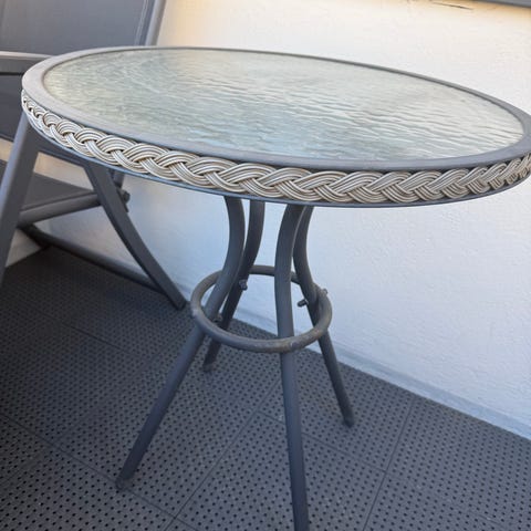 Rundt hagestolpebord i glass og metall.