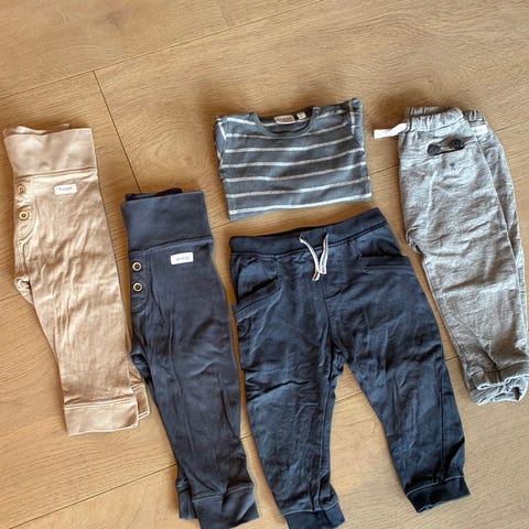 Bodyer i bomull for gutt i størrelse 86. Plaggene er flerfarget med ulike mønstre og motiver, og består av myk bomull som egner seg til hverdagsbruk. Korte ben og armer