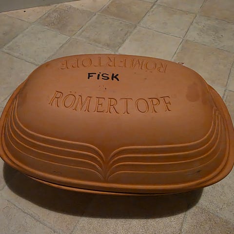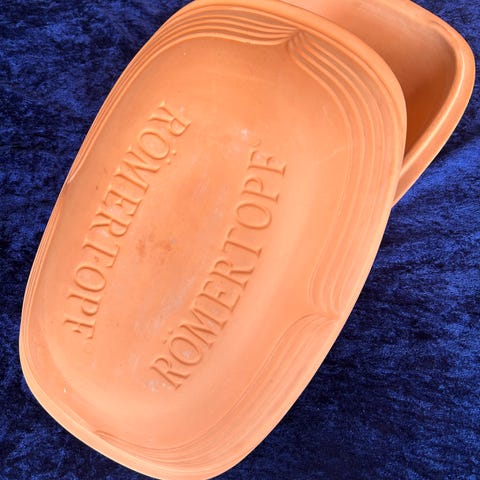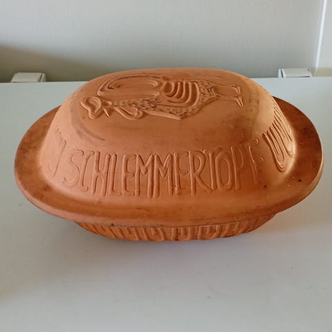 Tradisjonell stor Röhmertopf leirgryte for all slags mat som blir mørere av å stekes langsomt: store steker, kylling mm. Grønnsaker kan stekes med, noe som gir en deilig saus. Gryta er hel og fin. Må hentes.