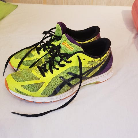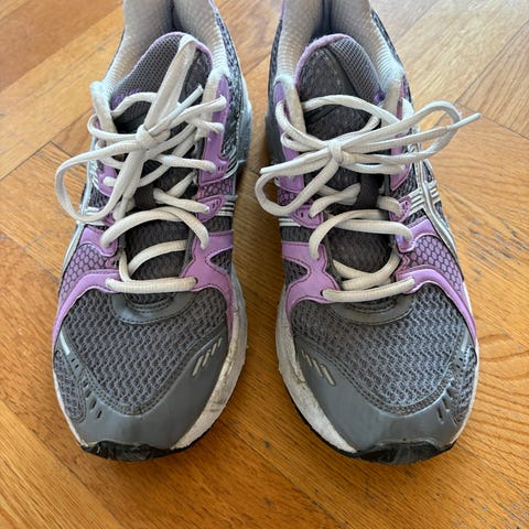 Asics løpesko i størrelse 40. Skoene er laget med pustende mesh-materiale i grått med røde detaljer og lisser. Yttersålen har gummimønster for grep ved løping på asfalt og lignende underlag. Egnet til løping og annen trening der det er behov for lette og stabile joggesko.