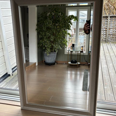 speil med dekorativ ramme. Rektangulært veggspeil med profilert ramme i klassisk stil. Speilet har oppheng på baksiden som gjør det egnet til montering på vegg, enten liggende eller stående, avhengig av plassering og behov. Vet ikke om det er ikea eller hvor fra.