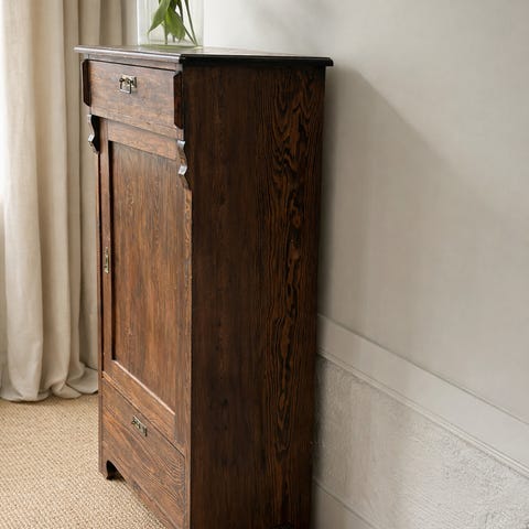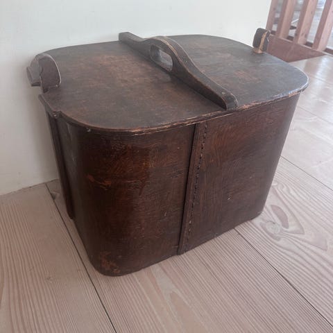 Trebeholder med lokk i rektangulær form. Beholderen er laget i treverk og har hengslet lokk med håndtak på toppen. Overflaten viser tydelig slitasje i lakken og noe avskalling av maling/dekor. Innvendig er den ubehandlet eller enkelt behandlet. Kan brukes som oppbevaringskasse, vedkasse eller til annen praktisk lagring i hjemmet.