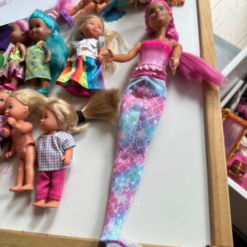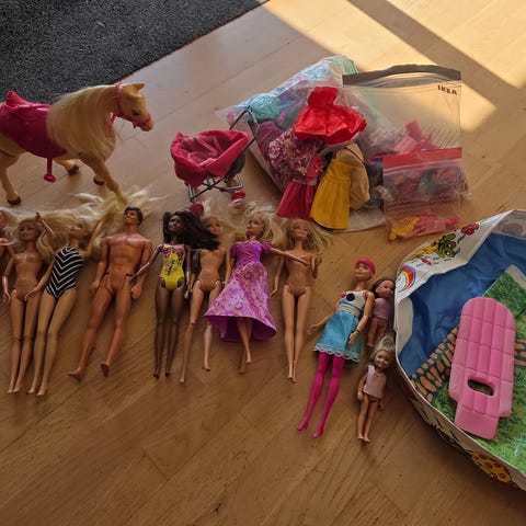 Barbie dukker og stylinghode med tilbehør. Pakken inneholder to Barbie-dukker i standard størrelse med klær, et stort stylinghode med blondt hår samt diverse hår- og stylingtilbehør som børster, speil og en liten palett. Lekesettet kan brukes til rollelek og hårstyling. Enkelte deler viser tydelig bruksspor, blant annet på håret til stylinghodet og dukkene.