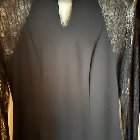 Svart, midi, shiftstyle, kjole med lange armer, blondedetaljer og lommer. Glidelås + knapp i ryggen. Blonder over skuldre og ned armer. Mangler stofflapp, men gjetter polyester, kanskje viskose (kan ta feil).