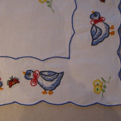 Selger for en nabo en vakkert brodert duk med påskemotiv. Den er brodert med bomullsgarn på bomullskvalitet.