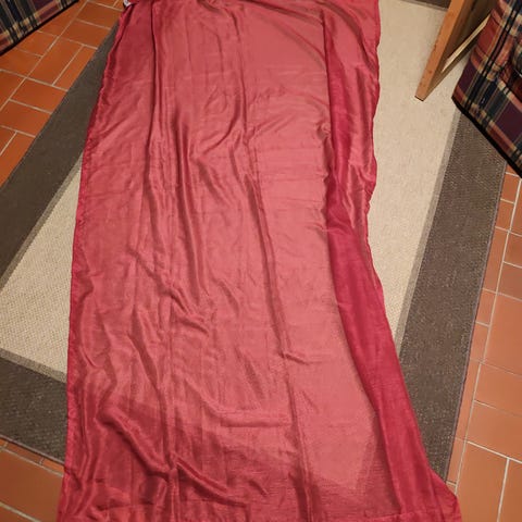 Kid gardin i rød farge med maljer øverst for oppheng på gardinstang. Gardinen har lett, vevd tekstur og passer til bruk i stue, soverom eller andre oppholdsrom der man ønsker å skjerme for innsyn eller dempe lys noe. Materialet fremstår som et tynt, gjennomskinnelig stoff.