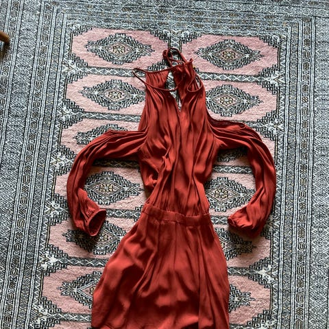 Zara Woman festkjole for dame i størrelse M. Kjolen er laget i polyester og har et flerfarget uttrykk med hovedsakelig rød bunnfarge og sorte detaljer. Ermeløs modell med kontrastfelt øverst og dekorative mønstre langs skjørtet. Passer til fest og andre anledninger der en pen kjole ønskes.