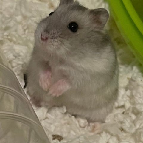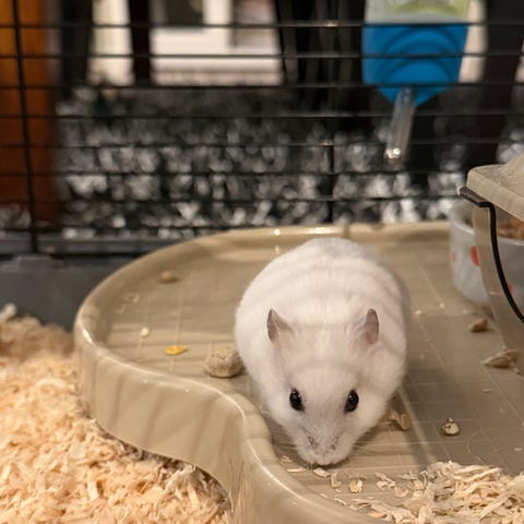 Kenny, som jeg har kalt hun, er en super snill, aktiv liten hamster. Elsker utetid (utenfor buret ikke bokstavelig talt utendørs), og kommer bort til døra på buret det sekundet noen er i nærheten (når hun er våken). Hun er under året (ca 8-9mnd). Og hun veier mellom 58- 60 gram, litt avhengig av dag.
