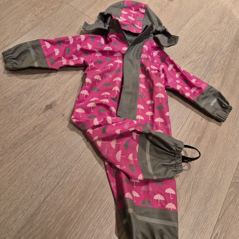 Selger regndress med flisfor. Dressen er hel, men har noe slitasje i reflexene og mangler hette. Denne dressen er kjekt å ha i barnehagen. Str 86