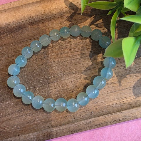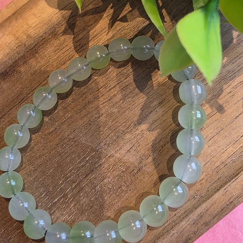 Selger et nydelig armbånd med runde, glatte Aventurin-steiner. Steinene har en rolig og vakker grønnfarge. Det er ubrukt brukt og strikken virker solid.