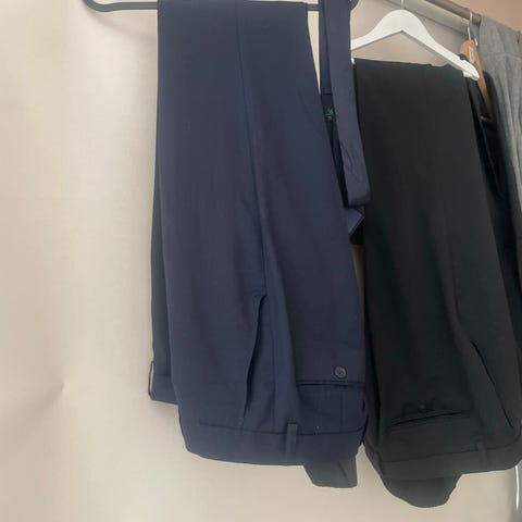 Dressmann bukse for herre i svart farge. Buksen er i størrelse S, merket 30/32 på lappen. Materialet består hovedsakelig av polyester, med innslag av ull, viskose og elastan ifølge vaskelappen. Klassisk buksemodell som passer til hverdagsbruk eller mer formelle anledninger, avhengig av hva den kombineres med. Lukkes med glidelås og knapp, og har beltehemper i livet.