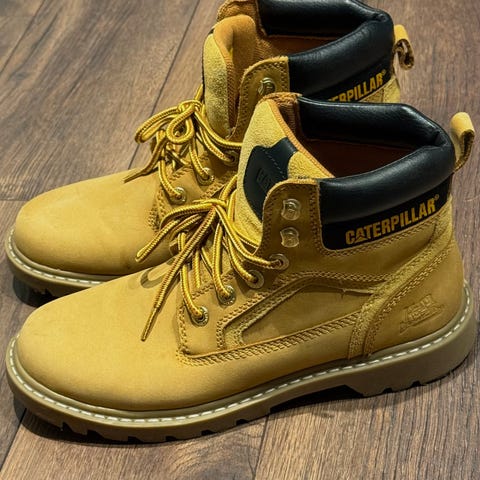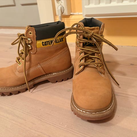 Caterpillar sko i skinn i størrelse 37. Modellen er en klassisk snørestøvel med kraftig gummisåle og grovt mønster for godt grep. Overdelen er i lys beige skinn med polstret ankelparti og CAT-logo på tunge og hælparti. Skoene har metallhemper til skolissene og forsterket tåparti. Egnet som robuste hverdagssko eller til lettere arbeid og fritidsbruk der man ønsker en solid støvel med kraftig såle.