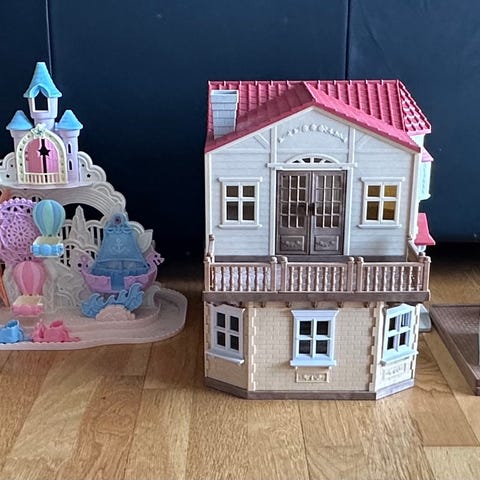 Sylvanian Families lekesett med trehytte og barnehageslott. Trehytten står på en stor trestamme med flere platåer, hus med vinduer og dør, balkong, stige og sklie. Slottet har to tårn, buet inngang og dekor med noter og blomster. Settet passer til Sylvanian Families-figurer (ikke inkludert) og gir mulighet for rollelek og utvidelse av eksisterende Sylvanian Families-miljøer.