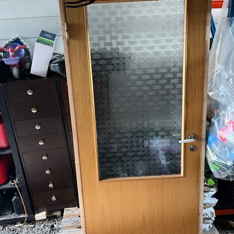 Brukt som innerdør mellom stue/gang. Passer i bolig, hytte eller bod der man ønsker lysinnslipp gjennom glassfeltet.