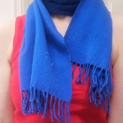 Gul ullskjerf med rutemønster i flere farger og frynser langs kantene.