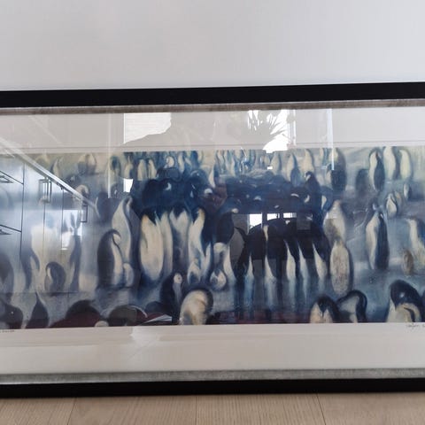 Bildet er et trykk på lerret i et hvit passepartout og en svart rektangulær ramme med glass. Kunst.