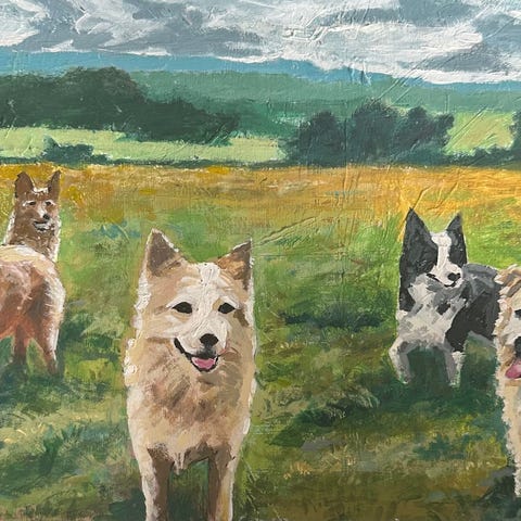 Innrammet bilde med et surealistisk motiv av en hai som blir tatt av en katt.