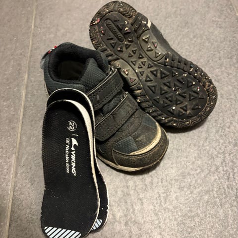 Viking barnesko i størrelse 22 . Skoene er i hovedsak svarte med lyse såler og blå detaljer. Overdelen er i tekstil med forsterkninger i syntetisk materiale. Modellen har borrelås og elastiske lisser for enkel av- og påtaking. Yttersålen er mønstret for bedre grep. Egnet som hverdagssko til barn.