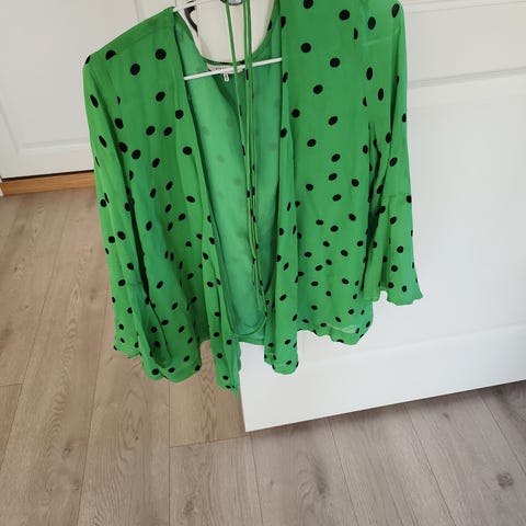 Overdelen er off-shoulder med korte, vide ermer, og buksedelen har rette ben. Buksedressen passer til bruk i hverdagen eller til enklere selskapelige anledninger.