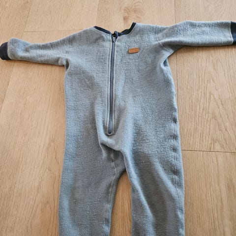 Voksi ulldress for baby i størrelse 50/56, unisex. Dressen er laget av 100 % merinoull i grå farge. Den har glidelås i front for enkel av- og påkledning, lange ermer og ben med myke ribbekanter. Plagget er merket med Voksi-logo og har Oeko-Tex Standard 100 Class 1-sertifisering. Egnet som varmende mellomlag eller ytterplagg for nyfødt og små babyer, både inne og ute avhengig av temperatur og øvrig bekledning.