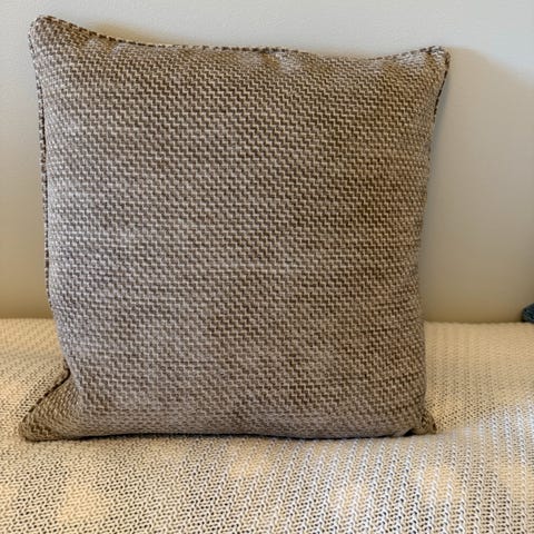 Stor pute i lyse blå plysj stoff. Veldig myk. Ikke brukt noe særlig, da den var kun til pynt på gjesterommet.