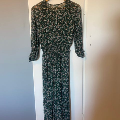 Kjolen er laget i viskose og har et flerfarget mønster i grønne, blå og lyse toner. Modellen har lange ermer, rund hals og lett rynket liv som gir vidde i skjørtet. Lukkes med knapp i nakken.