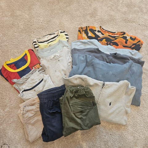 Klærne er brukt av en gutt, og det kan være bruksslitasje.Noen klær er lite brukt og andre plagg er mer brukt.