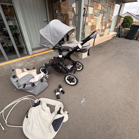Bugaboo barnevogn i grå tekstil. Vognen kommer med sittedel og liggedel, og kan byttes ut, når det passer.