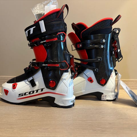 Scott randoneestøvel i svart, hvit og rød farge. Støvlene har flere spenner og kraftige powerstrap-reimer for god tilpasning rundt fot og legg. Innermodellen er polstret med rød fôr for økt komfort.