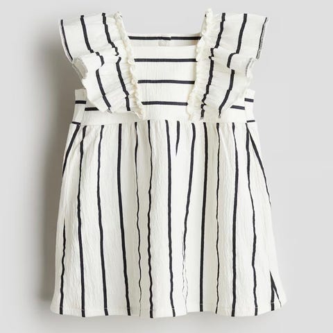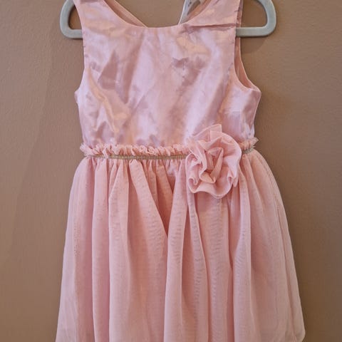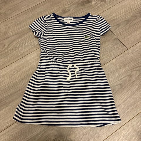 Selger en helt ny, kjempe fin kjole i str 12-18 måneder. Lett skjørt i flotte striper, med underskjørt og tilhørende truse. Toppen er brodert på framsiden.
