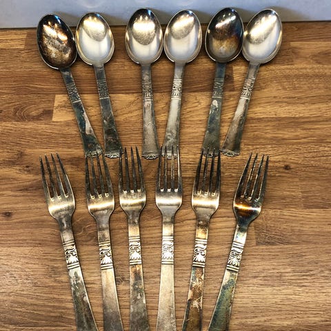 Bestikk i sølvplett med ulike mønstre. Settet består av flere spiseskjeer og gafler i forskjellig design. Bestikkdelene har stempler som viser sølvplettmerking og produsentkoder. Egner seg som bruksgjenstander på kjøkkenet eller som tillegg til eksisterende sølvplettbestikk.
