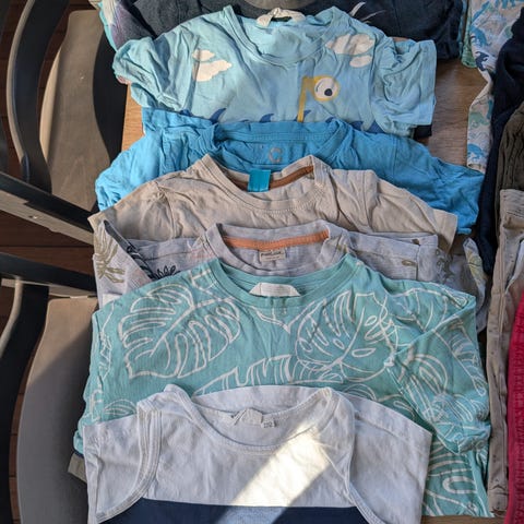 Gutteklær pakke i størrelse 98 i flerfargede varianter. Pakken inneholder ulike plagg for gutt, blant annet overdeler som t-skjorter og gensere, flere hettegensere samt flere bukser/joggebukser i forskjellige farger. Klærne er egnet til hverdagsbruk i barnehage og hjemme. Størrelse 98 passer typisk til barn rundt 2–3 år, avhengig av høyde og kroppsfasong. Inneholder klær fra Cubus, H&M's, o.l