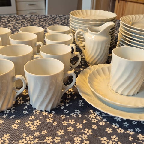 Porsgrund Porselen Bogstad kopp- og asjettsett i hvitt porselen. 8 hvite krus med hank samt tilhørende asjetter og skåler med riflet kant.