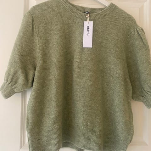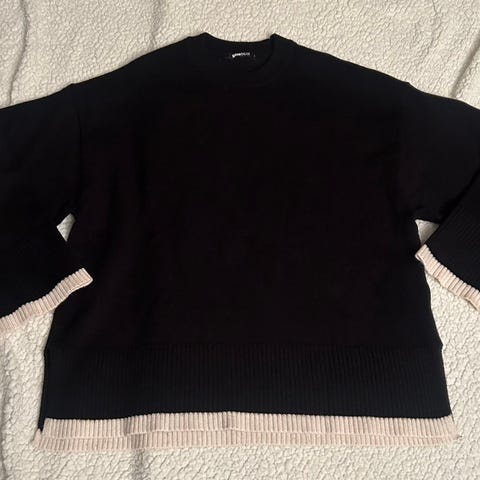 Gina Tricot genser for dame i størrelse L. Genseren er laget i polyester og har et design med åpne skuldre. Den har ribbestrikkede kanter nederst og på ermene. Fargene inkluderer blant annet mørk og lys tone, som gir et flerfarget uttrykk. Passer til hverdagsbruk eller som en enkel overdel til ulike antrekk.