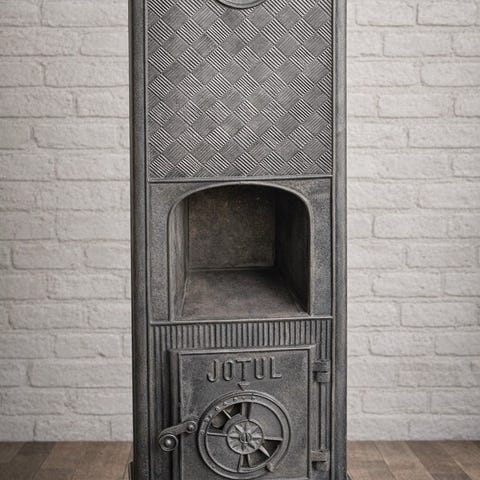 Jøtul nr 500 vedovn i støpejern. Ovnen har to frontdører med regulerbare luftspjeld og topp med røykrørstilkobling. Klassisk frittstående modell på ben, egnet for vedfyring i hytte, garasje eller andre egnede rom der vedovn kan installeres i henhold til gjeldende forskrifter. Overflate med synlig rust, og ovnen fremstår som et eldre eksemplar som kan egne seg til restaurering eller bruk der utseende ikke er avgjørende.
