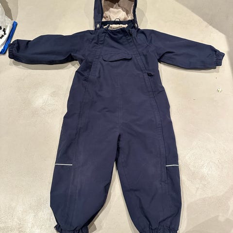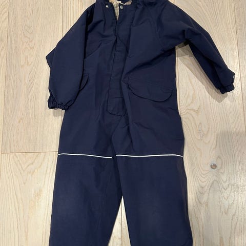 Mørkeblå vårdress fra Wheat, pent brukt. Satt i nye strikker under føttene. Enkelte små bruksmerker som ikke går av i vask bak på det ene benet, foran på venstre ben, se bilder, ingen betydning for bruk.