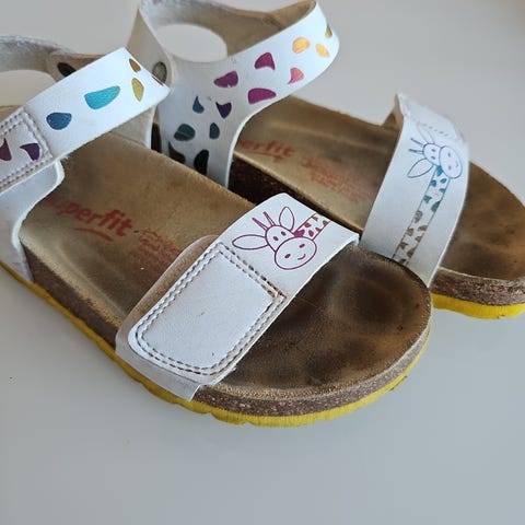 Primigi sandaler for jente i størrelse 28. Sandalene er flerfarget med rosa, gul og oransje rem. De har justerbar rem med spenne over foten og borrelås rundt ankelen for bedre tilpasning. Sålen er formet med lett mønster for grep, og innersålen er utformet for å gi støtte til foten. Passer som sommersko eller innesko for barn.