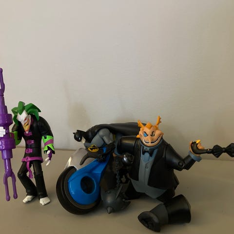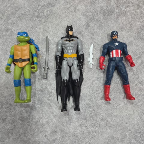 Selger en rekke actionfigurer fra filmene Batman Begins, The Dark Knight og Superman Returns.