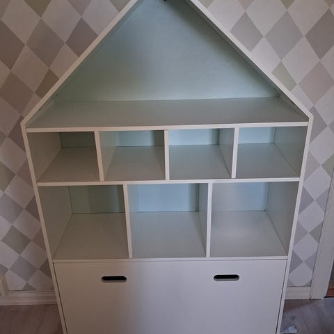 Liten bokhylle som passer perfekt i et lite hjørne. Her kan barna hente bøker selv 😊