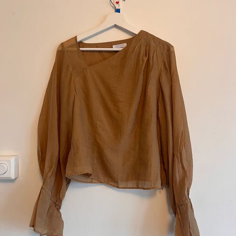 Nydelig & Other Stories topp for dame i størrelse M. Toppen er svart og laget hovedsakelig av lyocell. Modellen har korte ermer med volanger og dekorative blondedetaljer langs sidene og utringningen. Lukkes med knapp i nakken. Passer til bruk både til hverdags og mer pyntede anledninger.