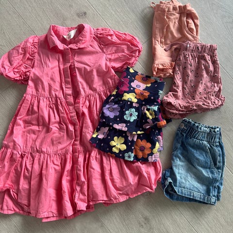 Tommy Hilfiger bluse for jente i størrelse 104. Blusen er rosa og har kort erm og krage med knepping foran. og en rosa topp (cubus) en blå jeans (H&M) som kan brukes som kombinasjonsplagg .