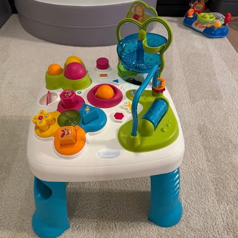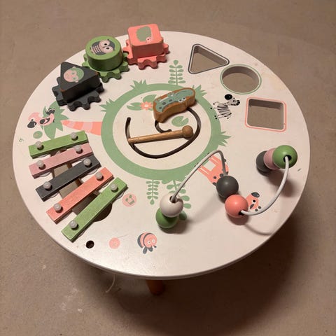Aktivitetsbord til baby og barn. Beina kan lett tas av så den kan ligge på gulvet og kan brukes før barnet kan reise seg. Den har vært veldig populær av våre barn.