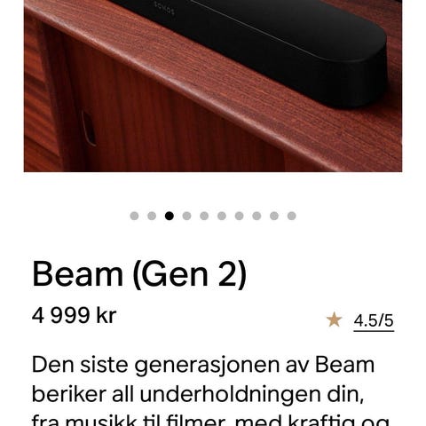 Sonos Beam Gen 2 lydplanke i svart. Kompakt soundbar som kobles til TV for forbedret lyd ved film, serier og spilling. Støtter tilkobling til hjemmenettverk for bruk med musikkstrømming og multiromsløsninger i Sonos-økosystemet. Egnet for plassering foran TV eller på TV-benk.