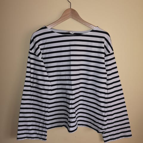 Stripet strikkegenser fra Sud Express i str S. Striper i hvitt, blått og gull.
