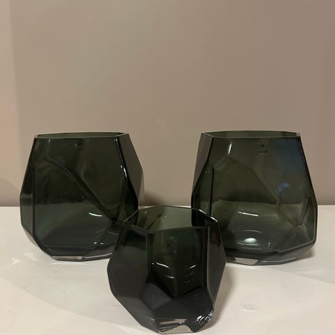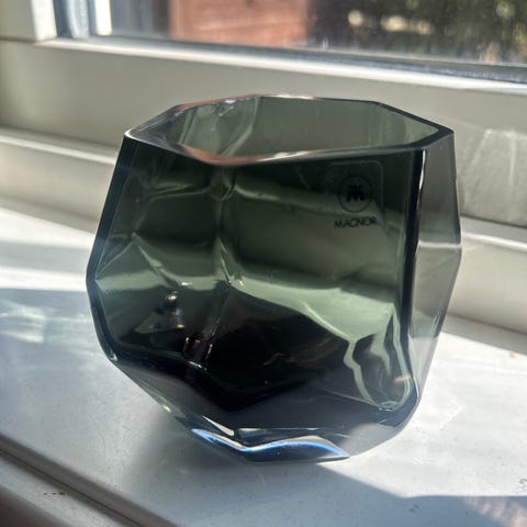 Magnor Glassverk lyslykt i farget glass. Modellen har fasettert, geometrisk form med blå og grønne toner som gir et skiftende fargespill. Egnet til telys eller liten blokklys. Kan brukes som borddekorasjon alene eller sammen med andre glassobjekter fra samme serie.