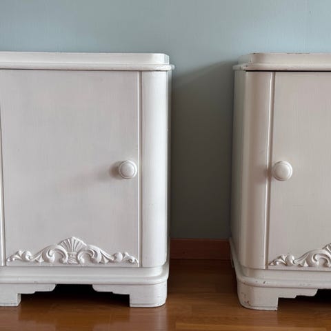 Selger to pene og solide nattbord i tre og rotting med et varmt og klassisk uttrykk.