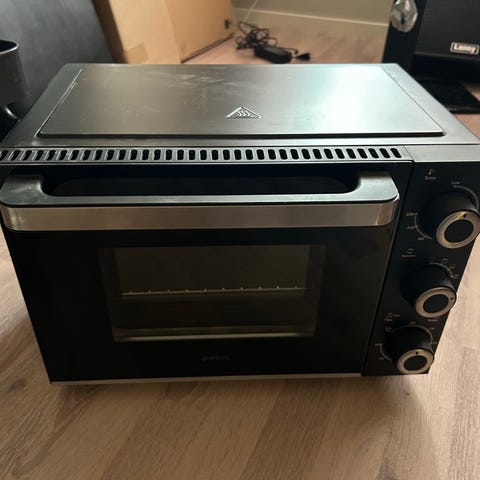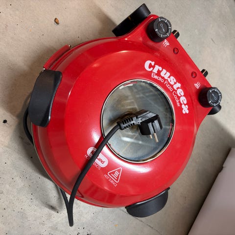Emerio pizzamaskin bordovn i terrakottafarge. Elektrisk bordovn utformet som en liten pizzadome, egnet for tilberedning av små pizzaer ved bordet. Leveres med flere små stekespader med håndtak, perforert stekeplate og bruksanvisning. Passer til innendørs bruk på kjøkkenbenk eller spisebord, og krever vanlig strømtilkobling.